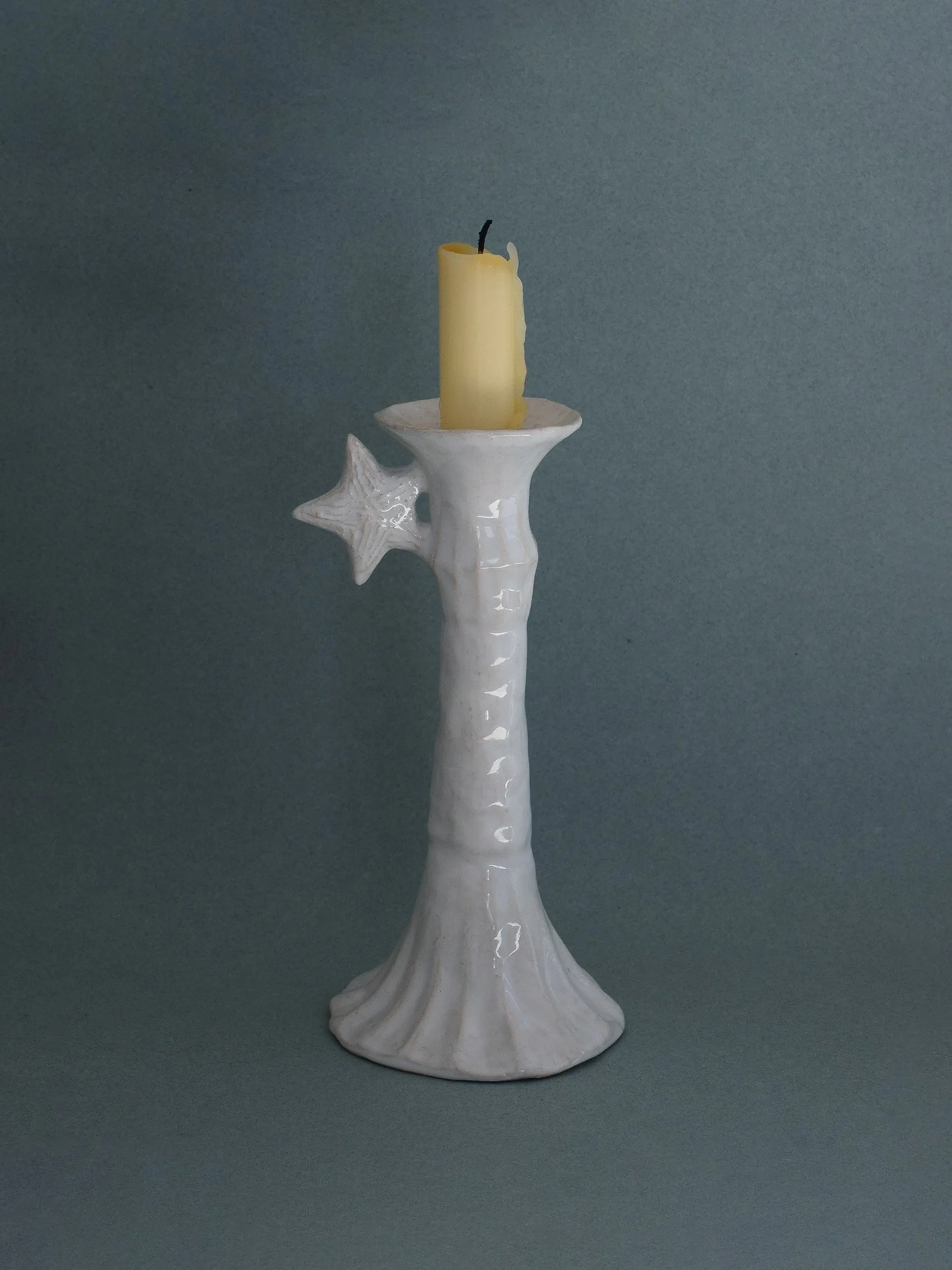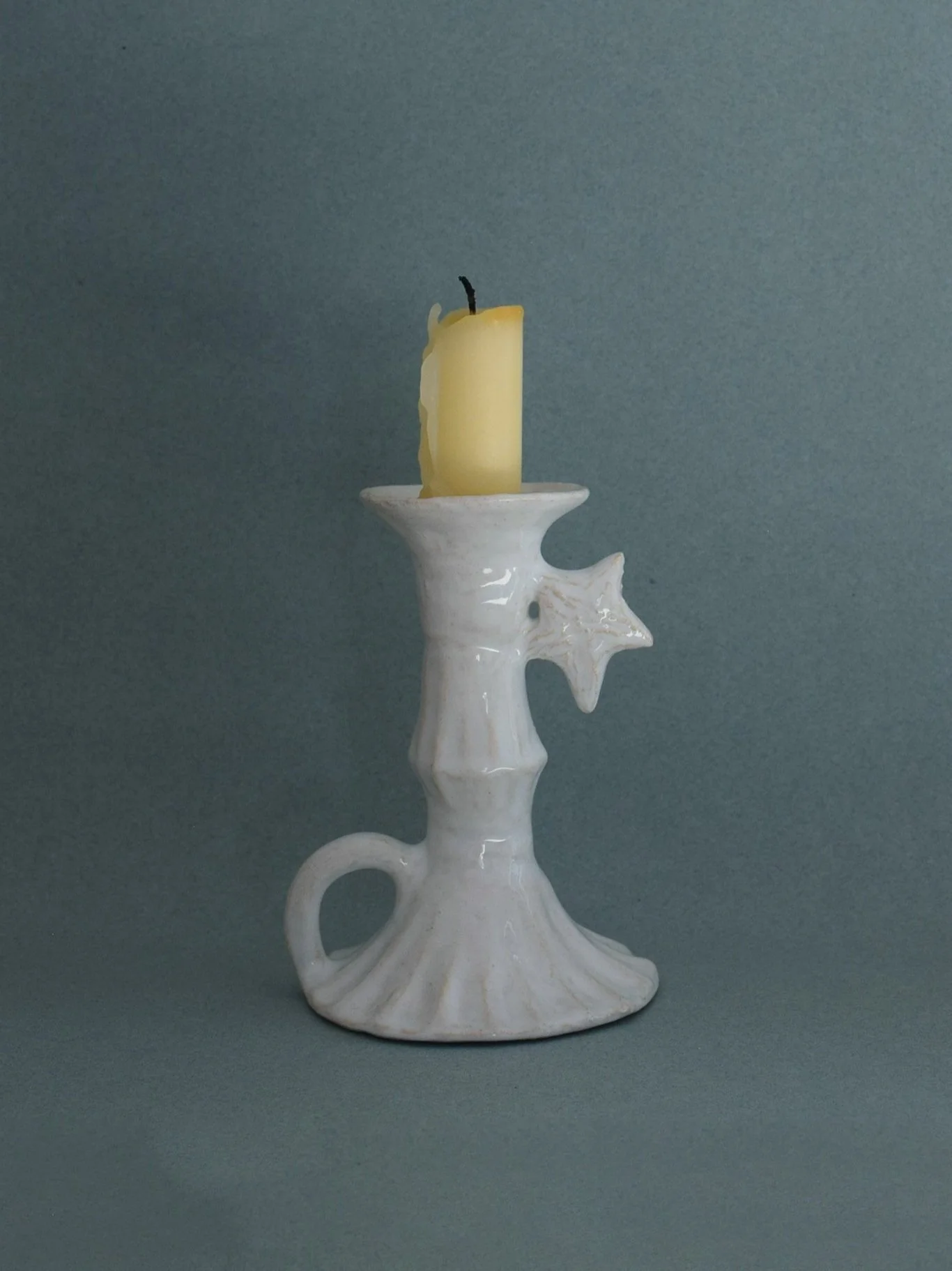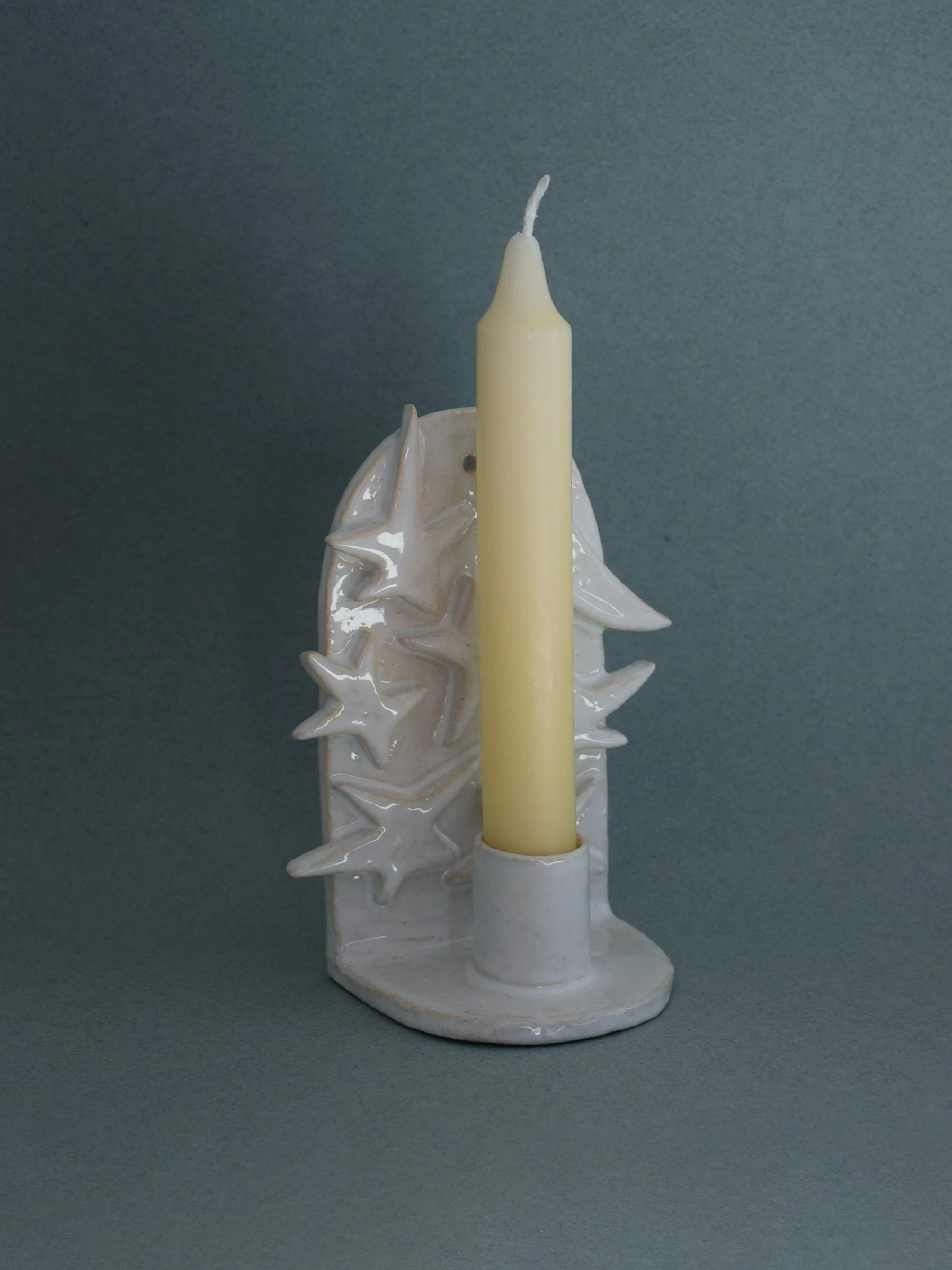 Série de céramiques inspirée du personnage iconique et populaire Pierrot. La pièce principale est une figure ornée d’une étoile, que l’on retrouve sur divers chandeliers, objets étroitement liés à la comptine. Le soleil et la lune, eux, évoquent le lien que Pierrot entretient avec les astres.