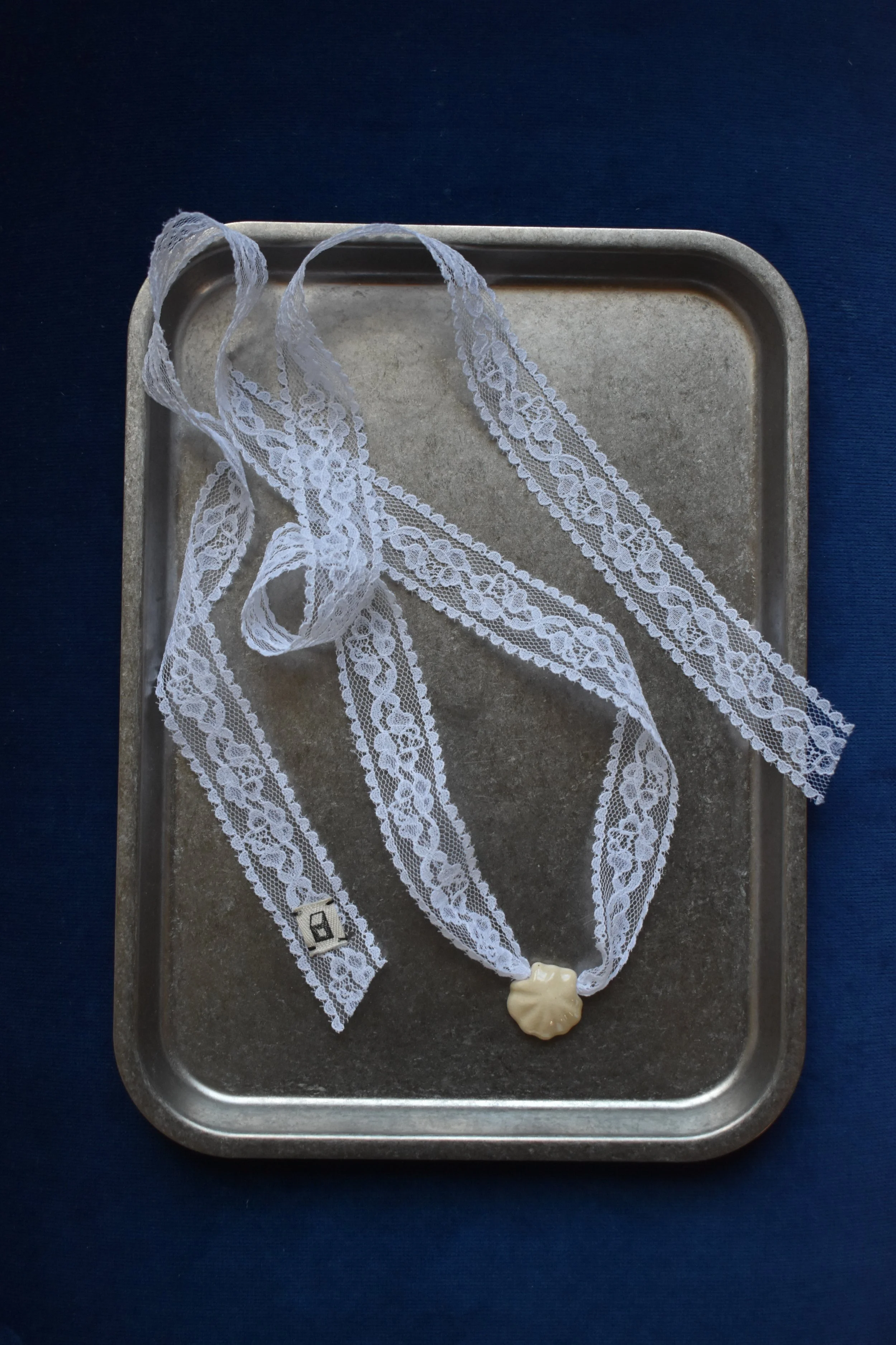Collection La Danseuse, colliers inspirés du ballet et des ballerines. Ruban en dentelle et suédine, pendentif en céramique émaillée.